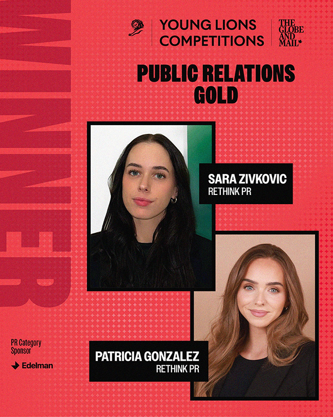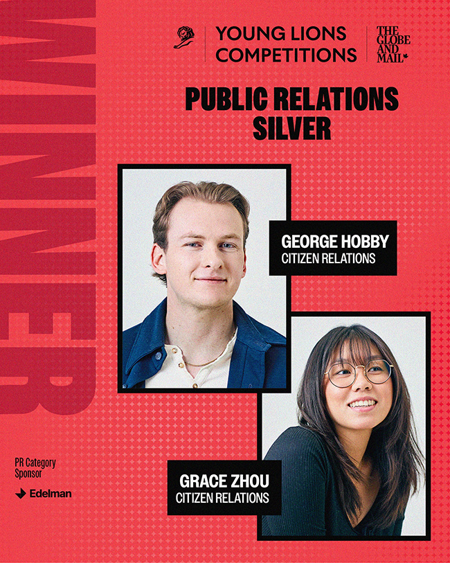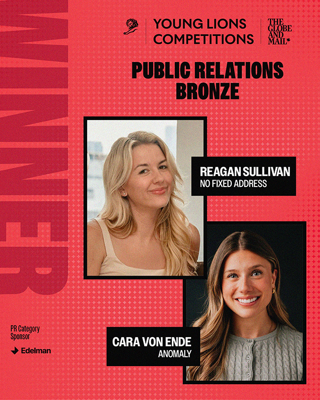 “Judging this year’s PR entries was a wonderful reminder of just how much creative energy Canada has, specifically with our emerging talent,” says Anthony Chelvanathan, Global Creative Partner & CCO Edelman, Canada. “Programs like the Young Lions are critical to push young creatives to think bigger, act faster, and prove themselves on a regional, and global stage. It was an honour to see them in action.”